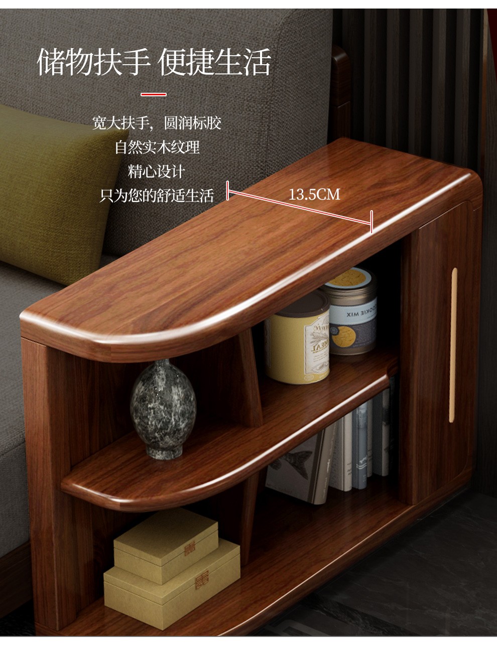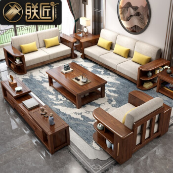 聯匠のソファー現代中国式の木のソファー金糸胡桃の木の貴妃の角を回転して物の布芸のソファーの1+2+3ソファーのリビングルームを組み立てて3人の位+貴妃の位の米の白い腰の枕の項を組み合わせます