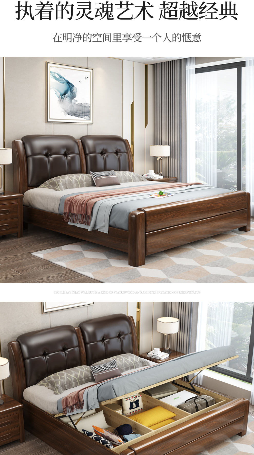 連結匠ベッド胡桃木の実木ベッド1.8 mダブルベッドの主な寝室軟包ベッド現代中国式1.5 mのシングルベッドの高箱収納物引出しベッド+1箱+8011 9つの分区ラテックスパッド(ハード両面)引出しタイプ