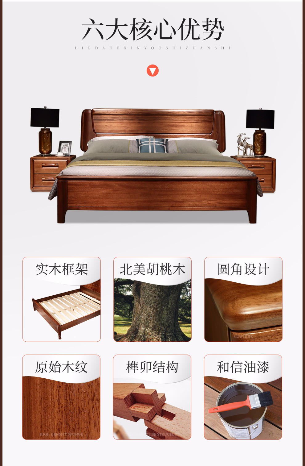 | 商品名称 | 鍛冶屋のベッドの実の木のベッドの胡桃の木の全実木のダブルベッドの1.8メートルの大きいベッドの結婚式ベッドの近代的な新しい中国式の寝室の家具は高箱の保管物のベッドの実木のベッド+ベッドの頭台*1 1500 mm*2000 mmをカスタマイズすることができます。 |