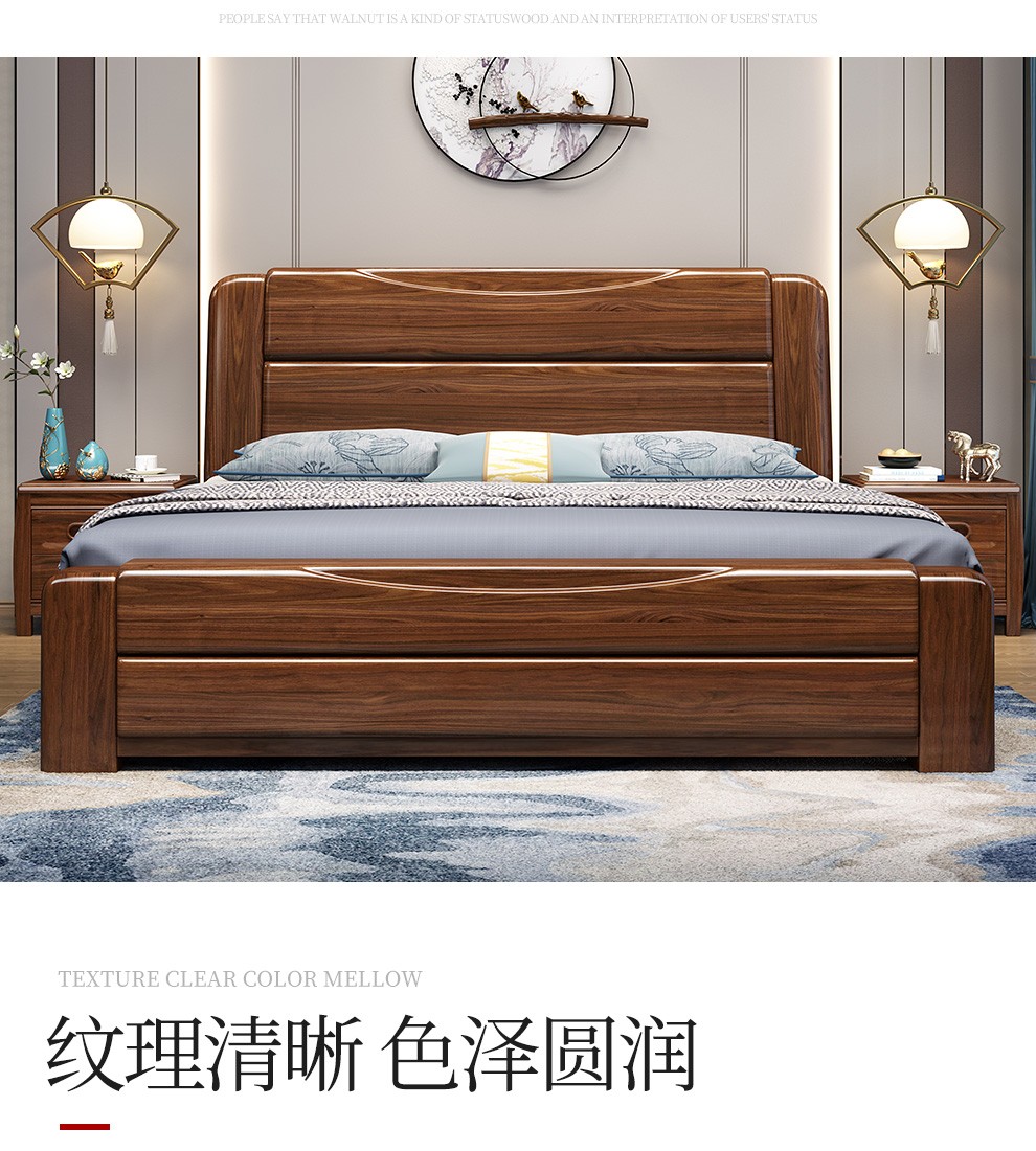 联匠ベッド金糸胡桃木の実木ベッドの主なベッドは1.8メートルのダブルベッドです。現代中国式家具寝室の収納物はシングルベッド1.5メートルの結婚ベッド+6105ベッドの頭台*2引き出しタイプです。