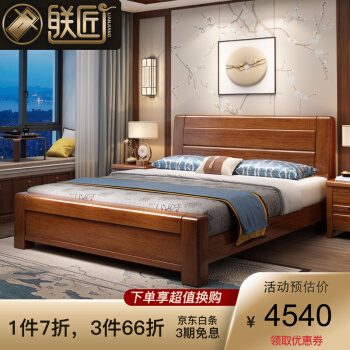 联匠床实木床ダブルベッド金糸胡桃木1.8メートル現代中国式の主な寝室の大ベッド、中国式の1.5メートルの高さの箱の引き出しベッド+2箱+589-5 Dのラテックスマットレス(硬質で快適)の引き出しタイプ