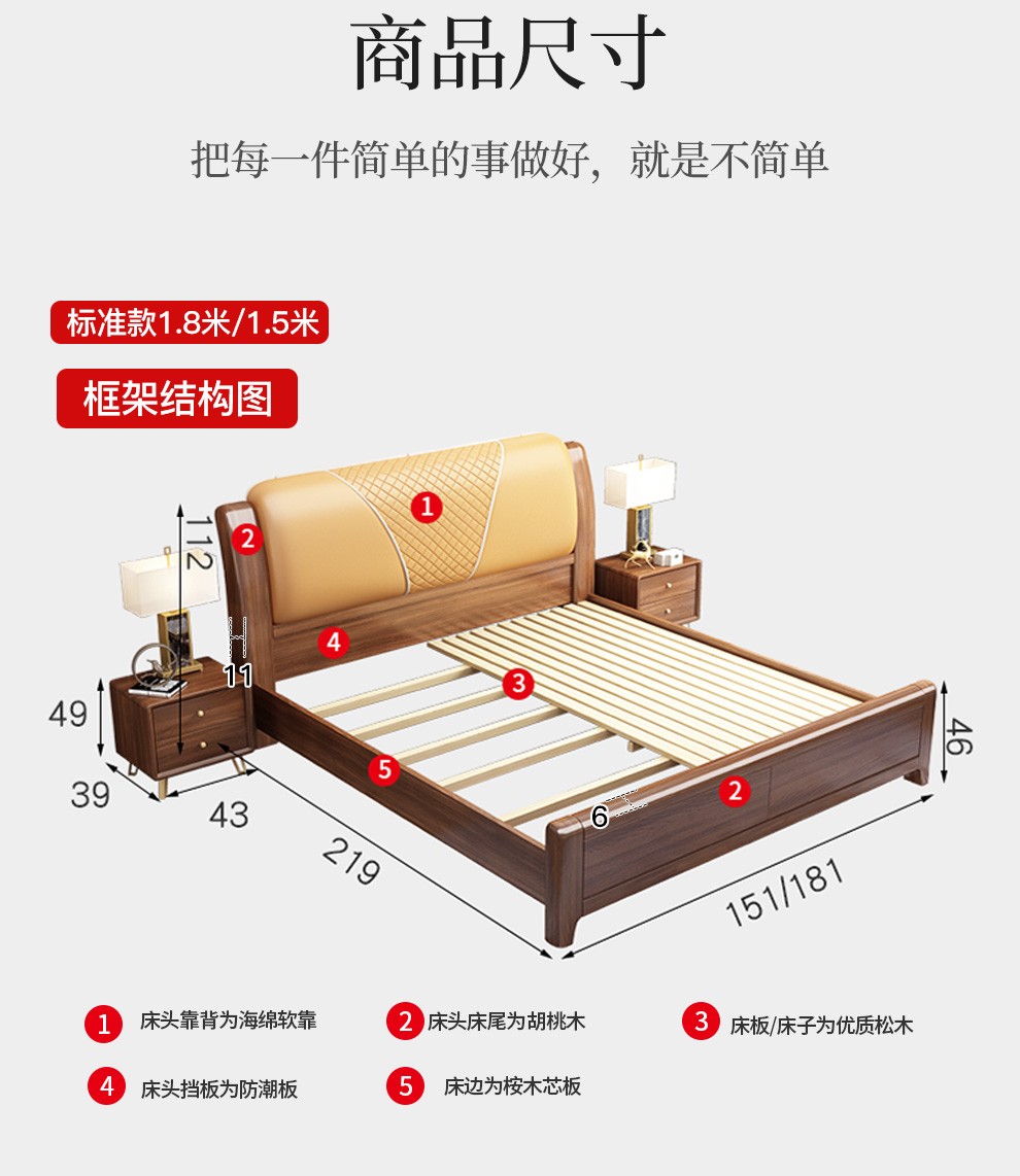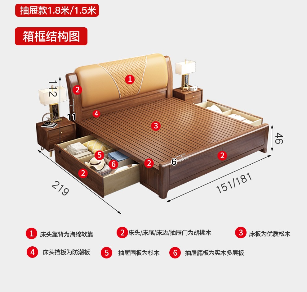 联匠床金糸胡桃木床床床の実木床1.8 m現代中国式高箱収納物ダブルベッドの主寝台1.5 m引き出しシーツの人用ベッド+2箱+589-5 Dラテックスマットレス(硬さと快適さ)標準タイプ